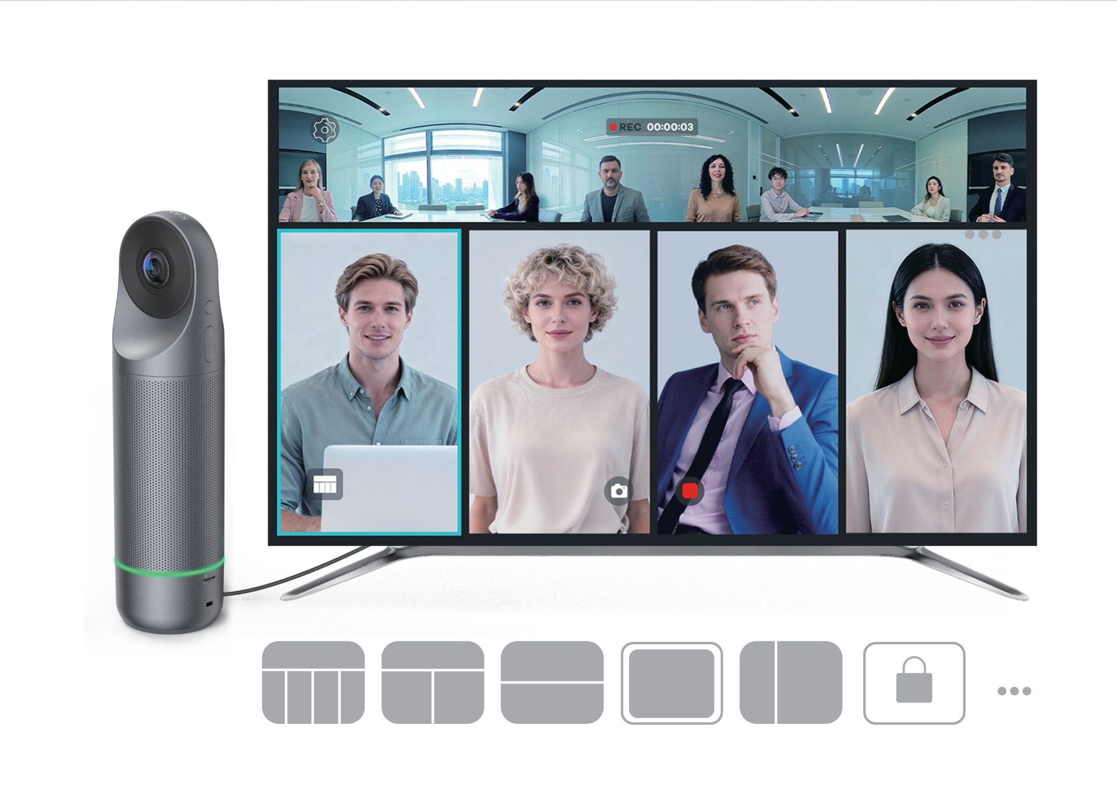 The Kandao Meeting Pro 2 offers more than just the 4 default views (Speaker, Gallery, Panorama, Forum). Users can create and save up to 16 customized layouts, ensuring every meeting—whether small or large, formal or informal—is displayed exactly the way you need for maximum engagement and clarity.